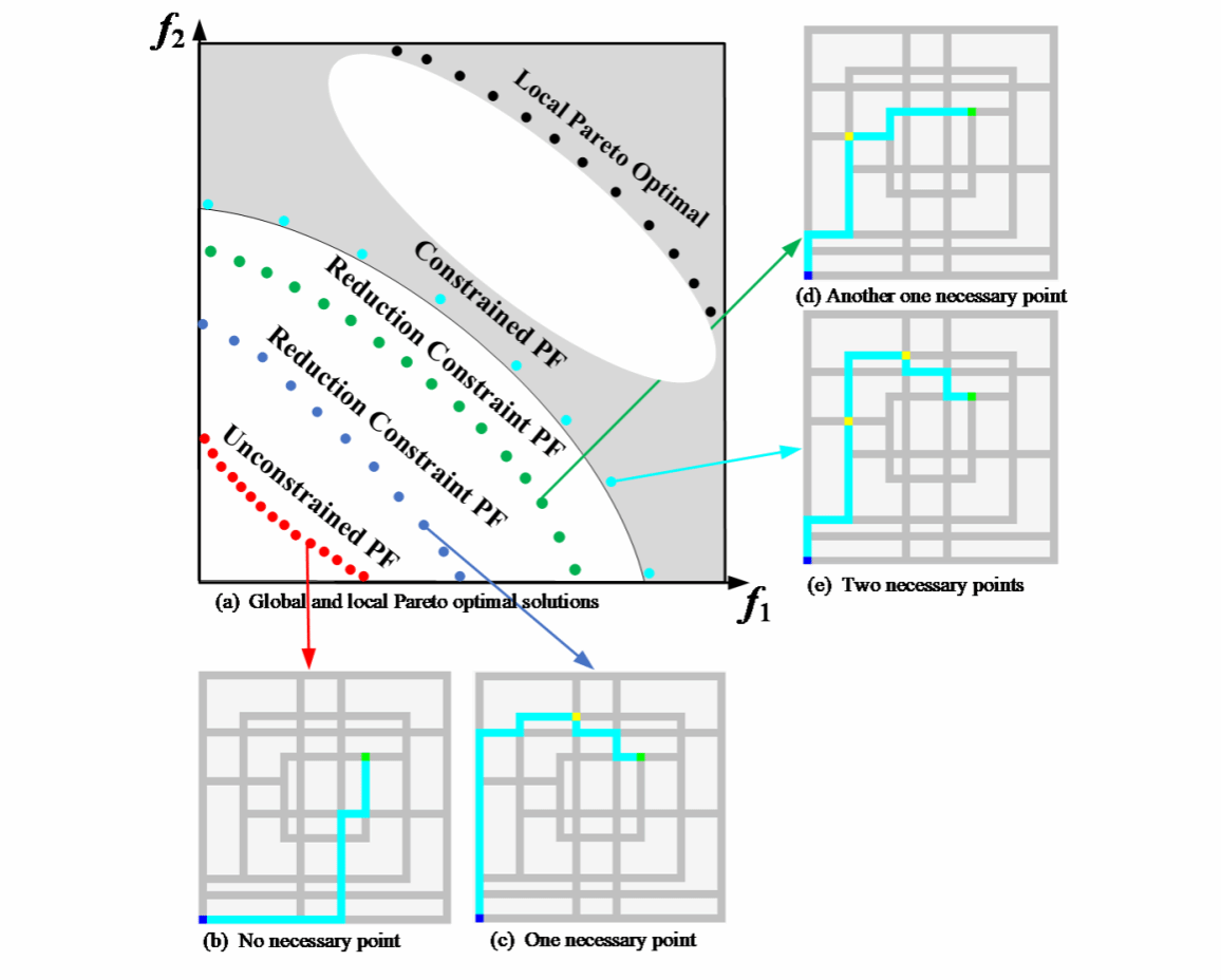 一是基于约束支配原则(Constraint Dominance Principle, CDP)的路径比较策略。该策略通过将每个必要点建模为独立约束,并引入约束满足度量机制,允许算法在进化过程中保留部分不可行但潜在优良解,有效穿越不可行区域,最终逼近真实的受约束帕累托前沿(Constrained Pareto Front)。