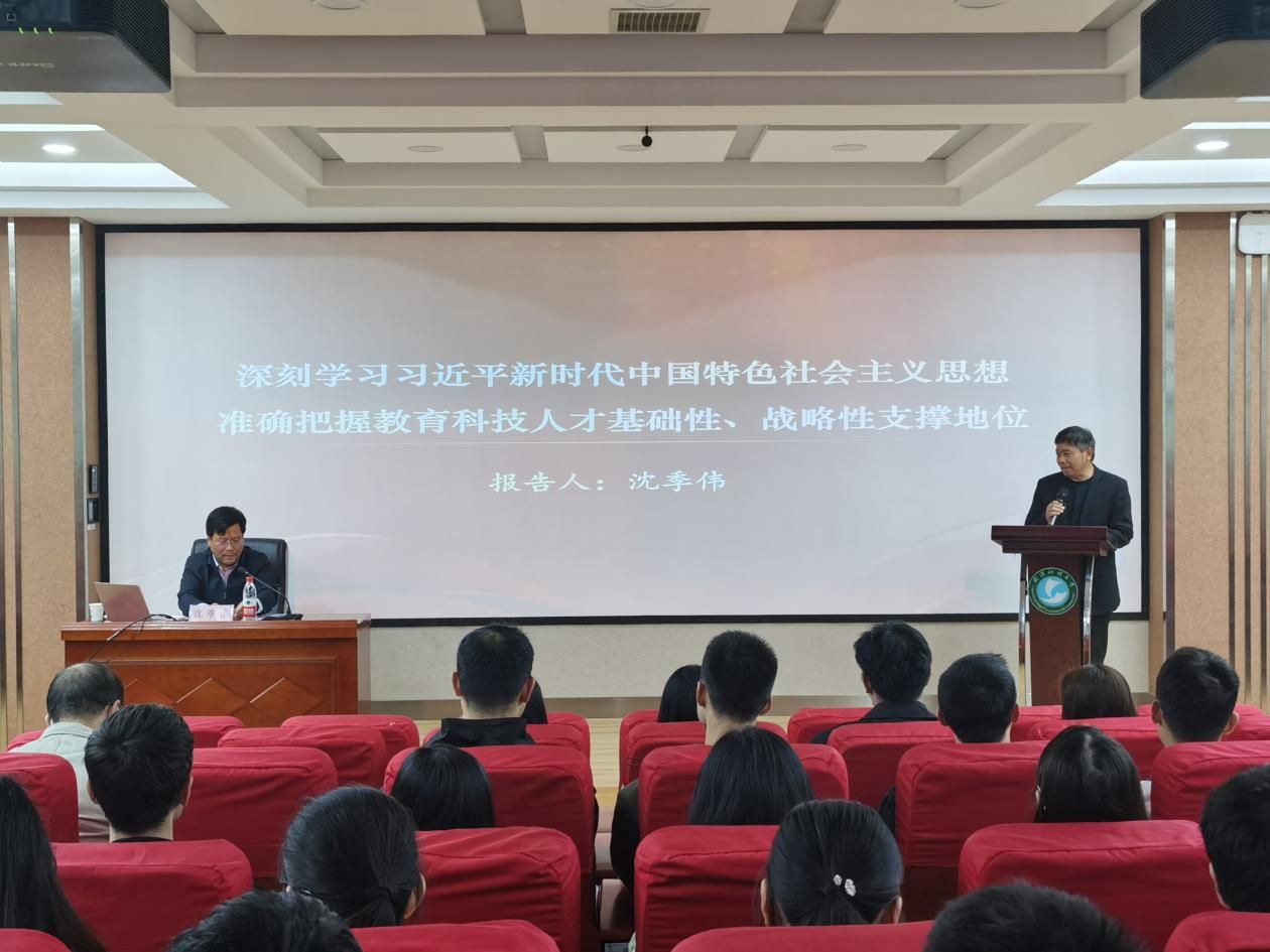 为更好宣讲习近平新时代中国特色社会主义思想,推动党的创新理论进课堂教材进头脑。5月10日,学院分党校在30404会议室举办“学习贯彻习近平新时代中国特色社会主义思想主题教育”专题党课,邀请沈季伟校长为本期发展对象党校培训党员讲授了题为“深刻学习习近平新时代中国特色社会主义思想,准确把握教育科技人才基础性、战略性支撑地位”的党课。全体院领导和师生党支部书记参加了学习。