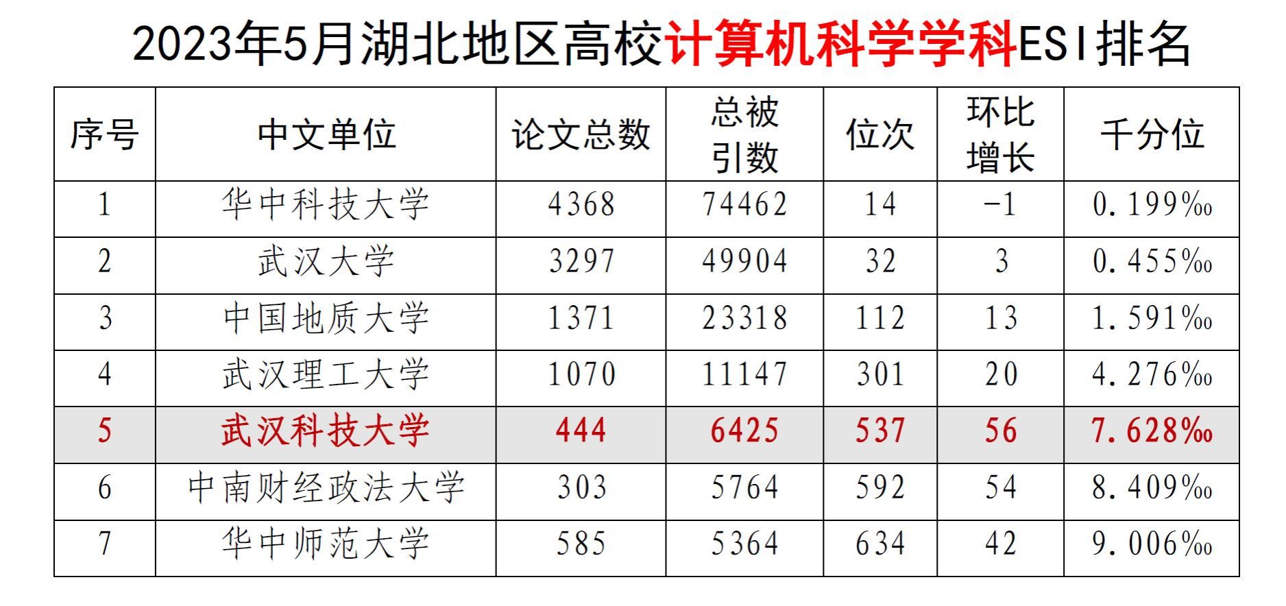 科睿唯安(Clarivate Analytics)基本科学指标数据库(Essential Science Indicators,ESI)是衡量高校科研水平的重要指标之一。2023年5月11日,科睿唯安更新了ESI数据库。最新数据显示,我校计算机科学、工程学等五个学科进入ESI全球排名前1%。其中,计算机科学学科湖北地区仅7个高校上榜,我校排名第五,学术水平和影响力明显提升。