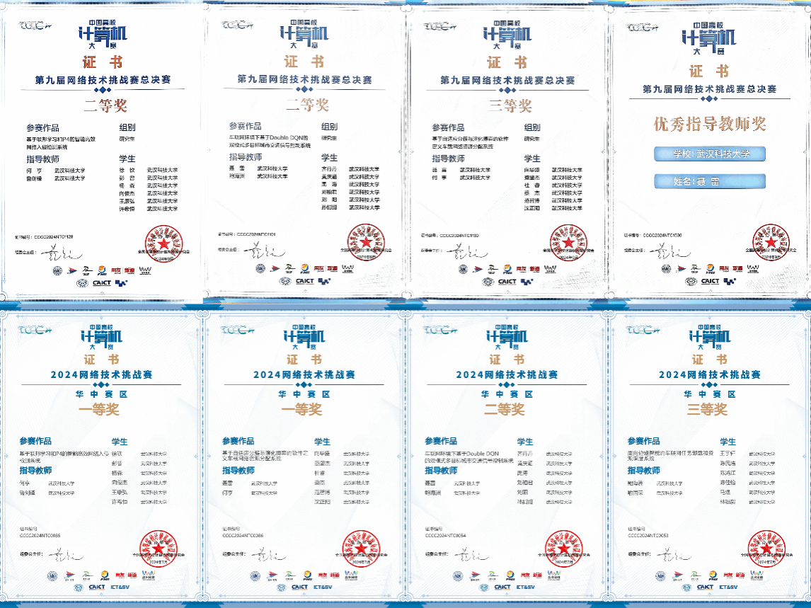 在本次比赛中,参赛队伍紧密围绕网络与信息技术的热点应用,精心选择研究课题。经过深入的商讨选题、周密的设计方案、严谨的实施研究、细致的数据分析以及精心的文档撰写,四支队伍分别呈现出了基于联邦学习和P4的智能高效网络入侵检测系统、车联网环境下基于Double DQN的双模式多目标城市交通信号控制系统、基于自适应分簇与演化博弈的软件定义车载网络资源分配系统以及面向边缘智能的车联网任务卸载和资源调度系统等创新作品。