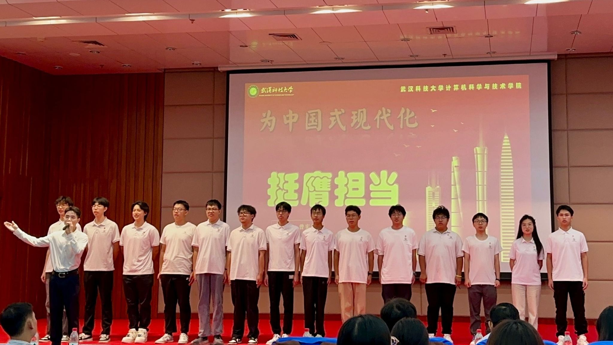在答辩过程中,带队老师曾宪森生动展现了为期34天的实践活动所取得的丰硕成果,将55名团队成员的深刻收获与成长悉数呈现在现场评审及观众面前。答辩的尾声,曾宪森携手实践队的学生代表们,以激昂的歌声共同演绎了《唱支山歌给党听》,并高声呼喊“没有共产党就没有新中国”,以此深情献礼新中国成立75周年,现场氛围热烈而庄重。
