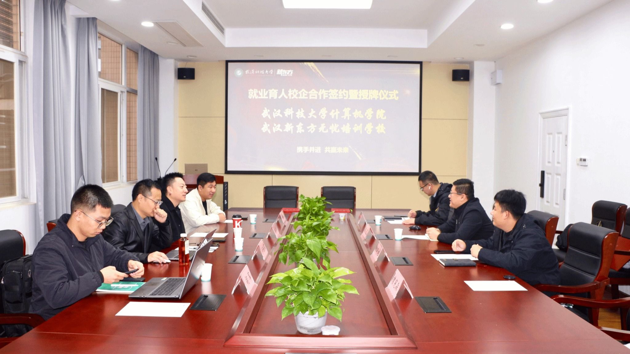 院新闻网讯(通讯员 曾宪森)为推进学院和企业之间产教融合,实现互利双赢,2024年11月27日上午,学院与新东方大学事业部武汉中心在教三楼会议室开展校企合作签约仪式。新东方大学事业部武汉中心校长孙占东、考研市场经理戈振兴、四六级项目经理卢陆军、新东方海棠书屋