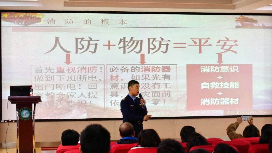 邀请武汉市进安消防中心警官廖曙光开展了“全民消防,生命至上”主题培训,并将节水节电教育融入其中。此次活动是学校消防安全月的重要环节,全院师生积极参与。