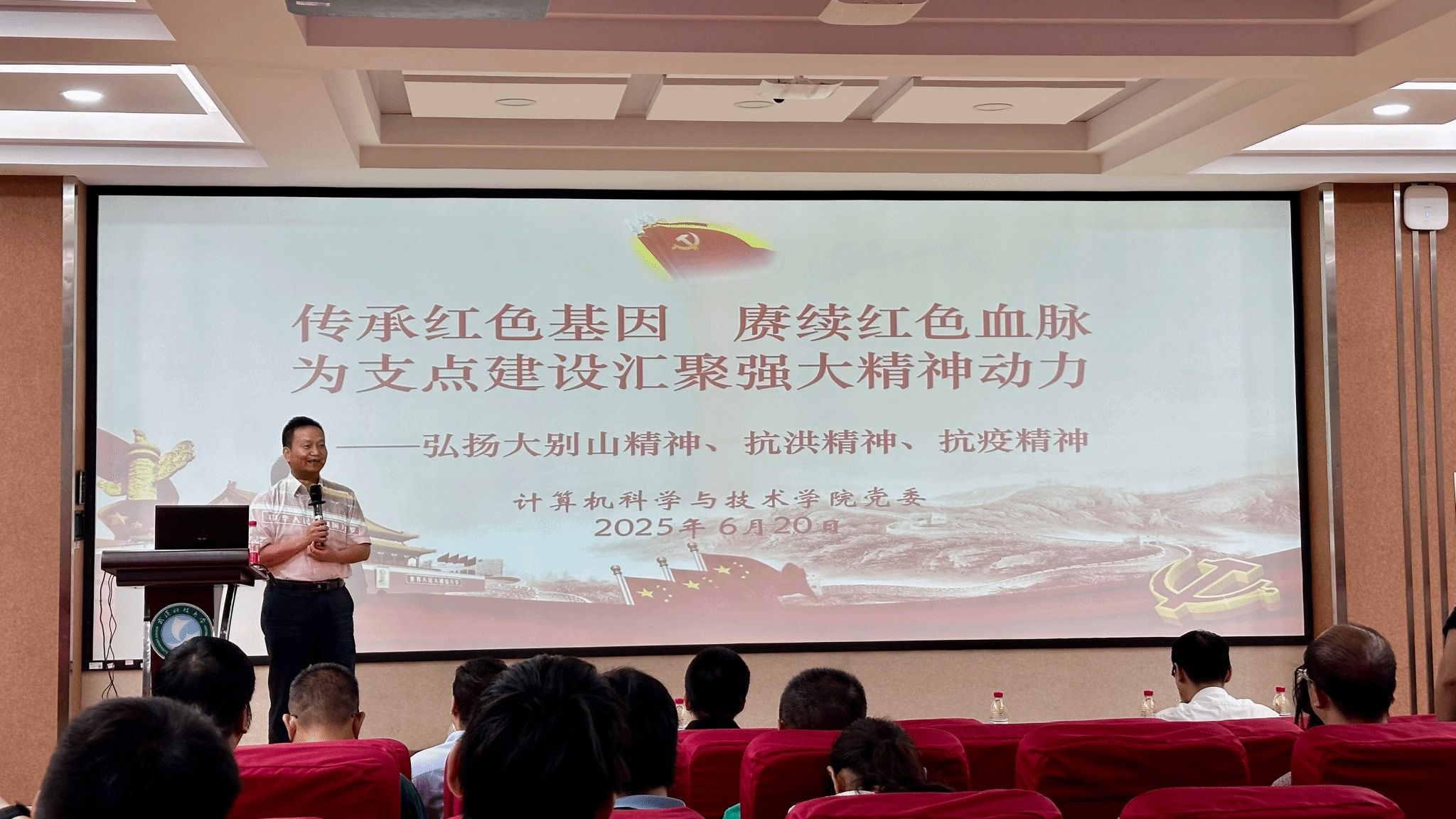 最后,余淑均为全体教职工讲授了题为《传承红色基因 赓续红色血脉 为支点建设汇聚强大精神动力——弘扬大别山精神、抗洪精神、抗疫精神》的专题党课。
