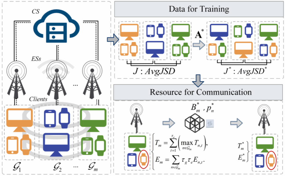 分层联邦学习利用边缘服务器丰富的通信资源来减轻部分通信负担,但非独立同分布(Non-IID)数据和有限的带宽资源会降低其模型性能。在当前研究中,数据服从均匀分布的强假设与多源异构的边缘计算场景明显不符,额外的模型训练或数据交换来检查数据分布将不可避免地增加计算成本和隐私泄露的风险,而通过聚类数据分布来选择客户端的方法难以保证最终数据分布的最优组合。因此,如何在不涉及原始数据的情况下减少Non-IID数据的影响,合理化通信资源分配以减少总执行延迟,是当下急切需要解决的问题。陈悦同学的论文提出了一种基于联盟形成博弈的分层联邦学习优化方法,LEAP,以减轻Non-IID问题和通信瓶颈。具体而言,LEAP衡量了边缘服务器之间的Non-IID程度,并将客户与边缘服务器之间的相关性动态调整至最佳,从而减少Non-IID数据的负面影响。在稳定联盟划分的基础上,进一步对不同联盟进行带宽分配,确保在指定的时延约束下的最优传输功率以提高训练效率。实验结果表明,与最先进的基线相比,LEAP能够提高20.62%的模型精度。相比于随机带宽分配的方法,LEAP能够实现降低至少55.53%的传输能耗。