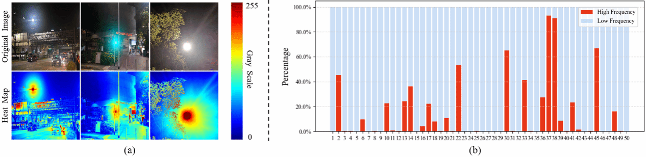 此外,在现实世界中,多种形状的辉光效应对夜间能见度造成了严重影响,而这一领域的研究尚显不足。为了有效提升夜间整体能见度,王薇博士团队提出了一个基于物理模型指导的训练框架,该框架能够生成接近场光源辐射特性的夜间成像模型,并对六种辉光形状类别中的光源生成器进行了生成有效性的验证。在此基础上,团队进一步提出了一种可扩展的光敏盲反卷积网络,以解决直接传输图和光源图的盲分解问题。该方法巧妙融合了深度学习策略和物理领域知识,构建了高效的算法框架,并在多个真实数据集上取得了显著成效,不仅提升了夜间可见度,还优化了多个下游高级视觉任务的表现。