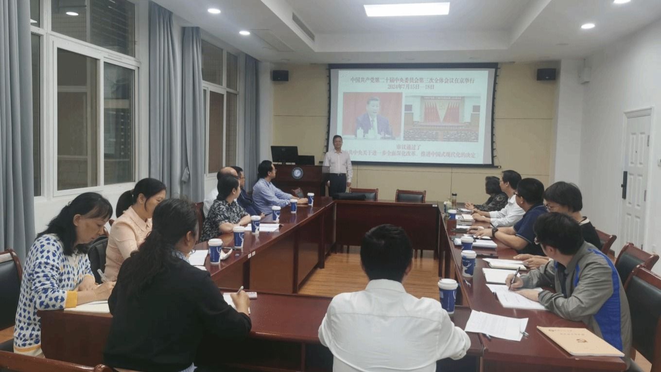 召开党委(扩大)会议,专题学习党的二十届三中全会精神。学院党委书记余淑均主持会议并讲授专题党课,学院领导班子、各系室党支部书记、系室主任、各科研团队负责人参加了学习。