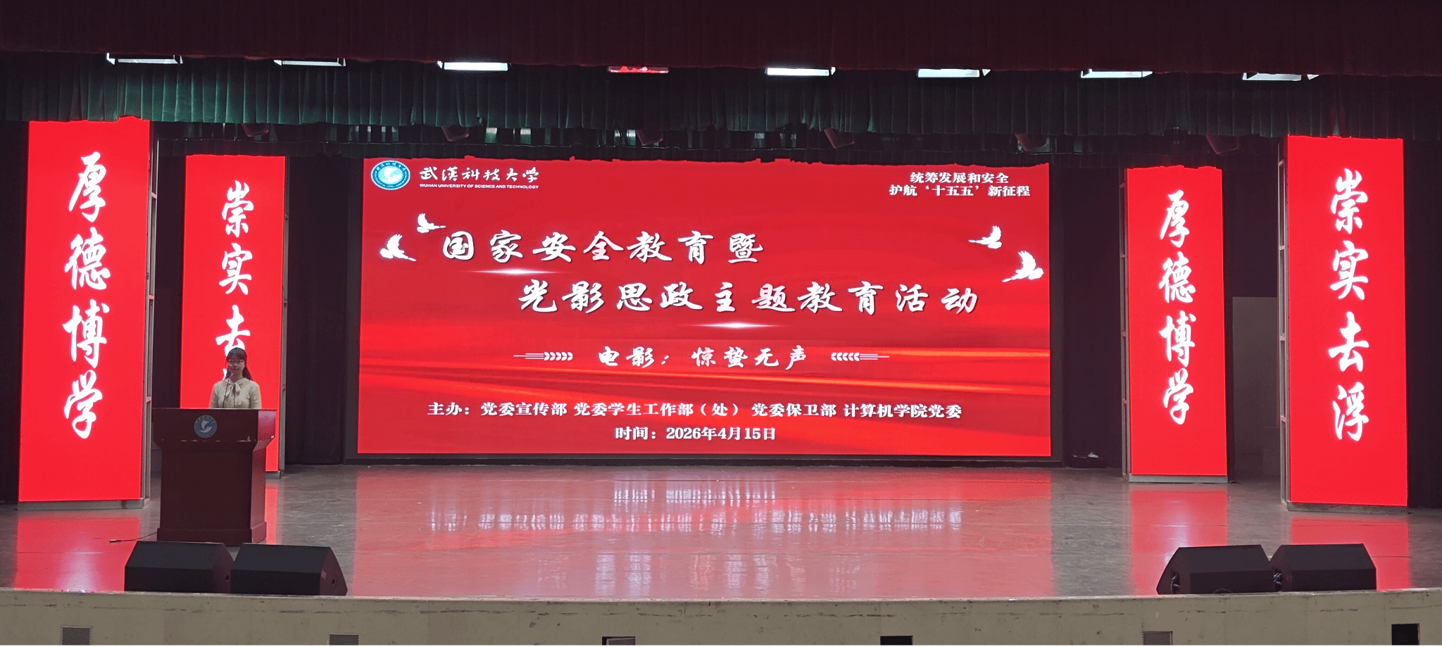 武科大网讯(通讯员肖卓灵 万杰斌)“统筹发展和安全,护航‘十五五’新征程”。4月15日晚,海棠书屋 国家安全教育暨光影思政主题教育活动在黄家湖校区沁湖礼堂举行。各学院近500名师生代表共同观看当代国安题材影片《惊蛰无声》。活动由党委宣传部、党委学生工作部、党委保卫部、海棠书屋 党委联合主办。