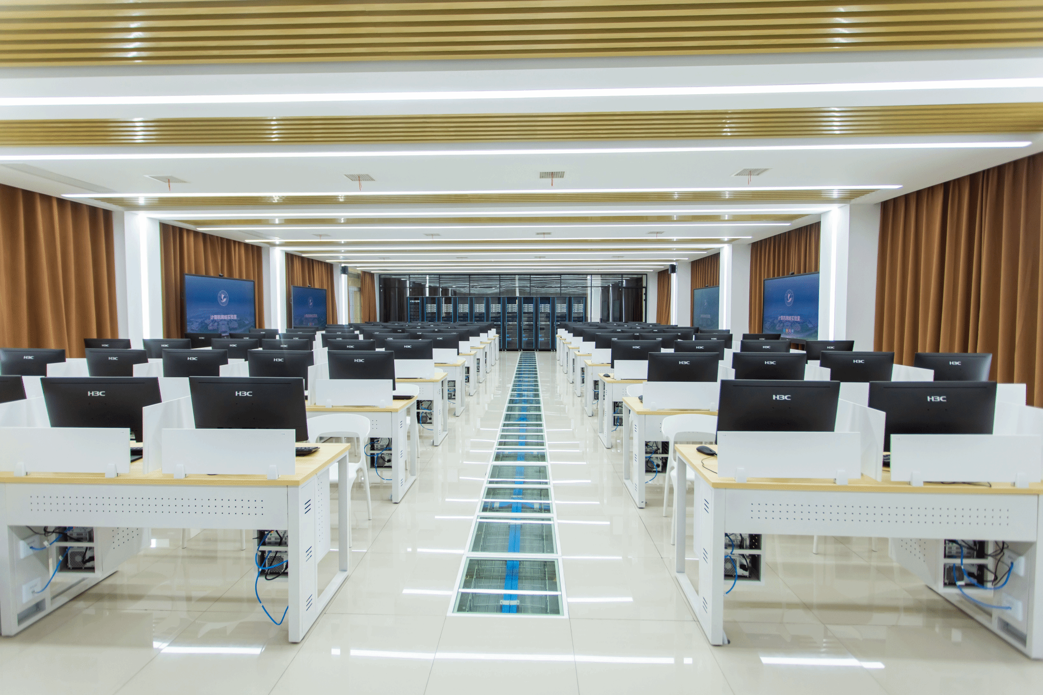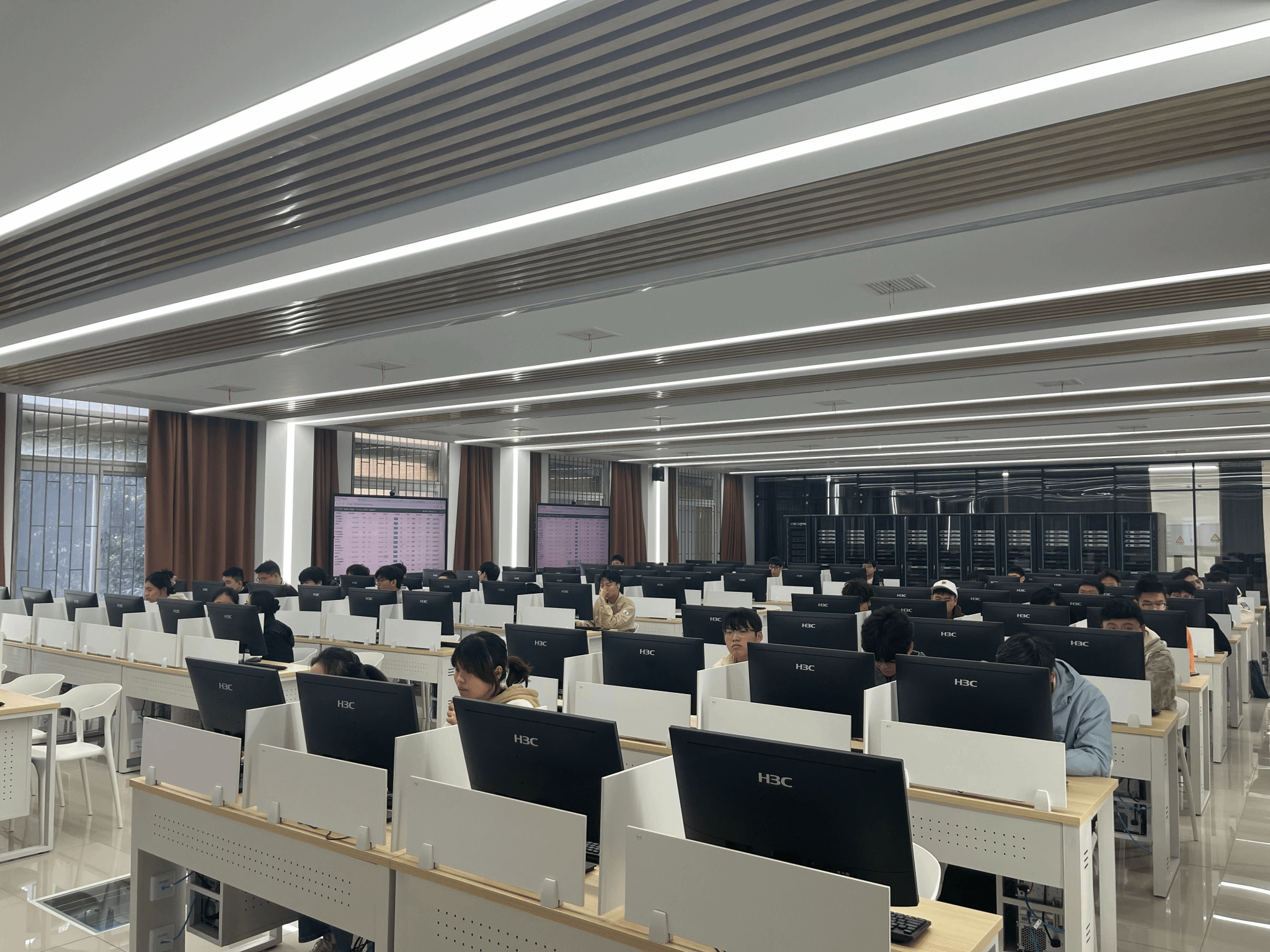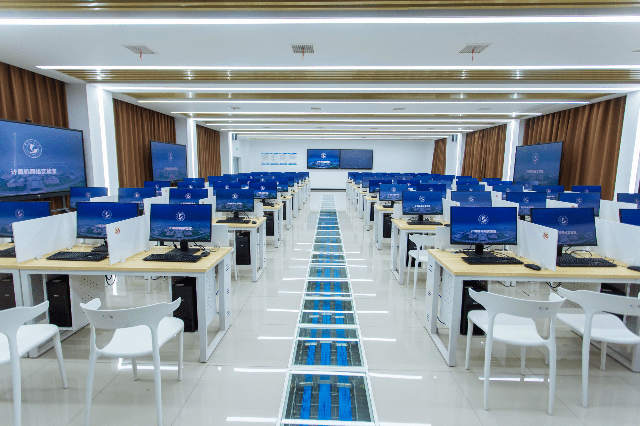 实验室设备主要包含:H3C学生机90台、教师机1台,H3C网络设备10套,互联式86寸大屏4块。除此之外,还搭建了希冀教学平台、噢易教学管理软件和电子班牌,有助于数字化、智能化教学。